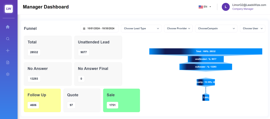 LeadsWize offers a full out-of-the-box reporting suite. Managers can obtain valuable insights on their sales and marketing operation simply by clicking a button.